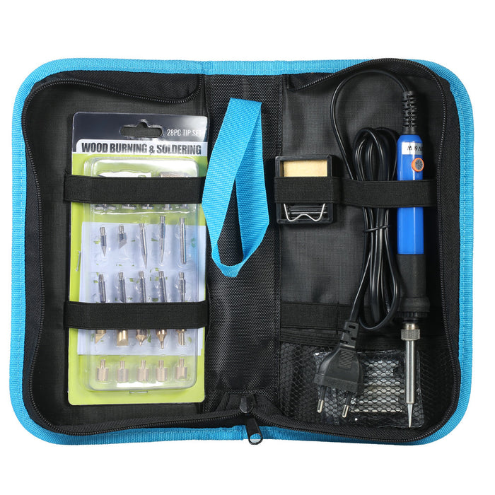 This mini electric 2 in 1 wood burning kit includes a 60W electric soldering iron, 1 iron stand, 5 assorted solder tips, 10 assorted wood carving tips, 15 assorted wood burning & soldering tips, 1 hot knife chuck, which make wood soldering jobs, wood working, hobbies, crafting, home improvement more convenient.
